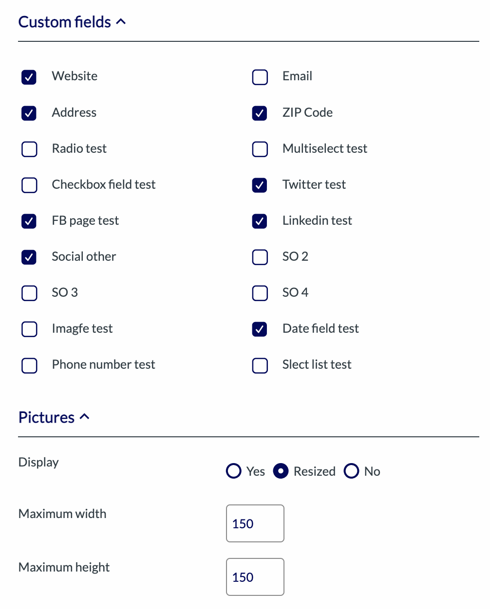 * **Pictures:** choose whether to display the pictures. You can automatically resize them to a specific size. It does not hide the Featured image since it has a dedicated option.