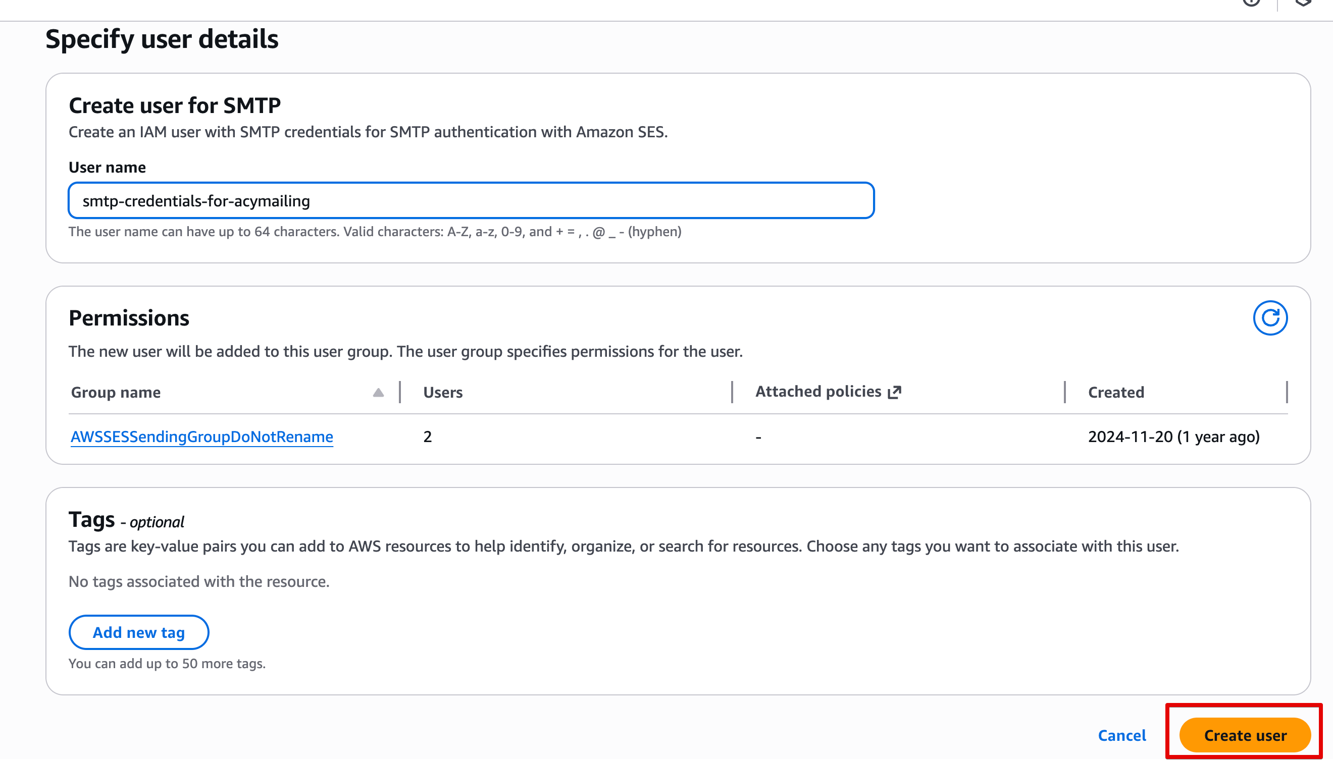 After clicking the "**Create SMTP credentials**" button, give it a clear name that your future colleagues will instantly understand in a few years, then click "**Create user**":