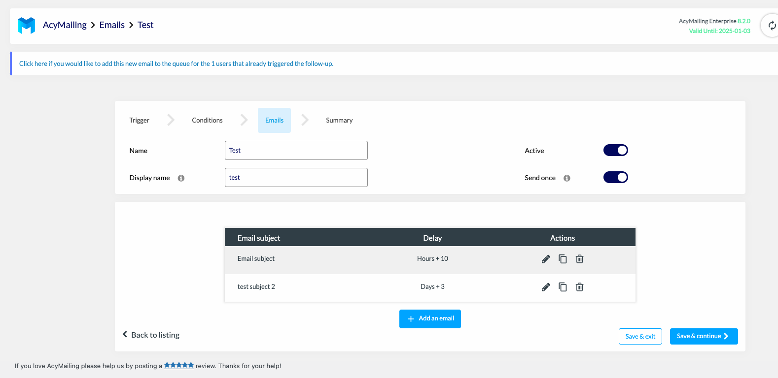 On the emails listing you'll be able to edit/duplicate/delete the ones you already added.